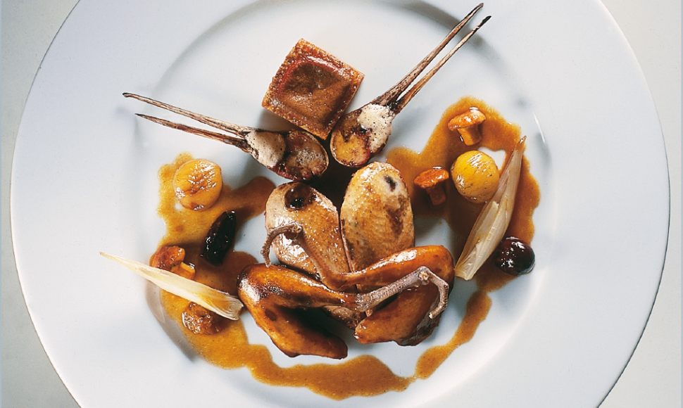 Oiseau au long bec cuit au poêlon, garniture forestière, une rôtie de ses abats