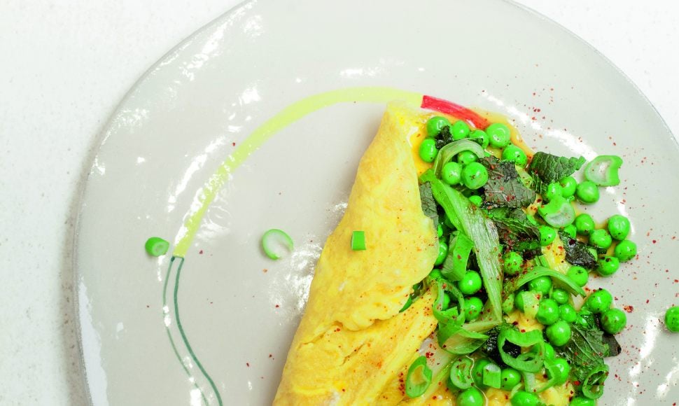 Déposez les petits pois et les cébettes au milieu, 1 min avant la fin de la cuisson. Roulez l’omelette sur un plat et servez.