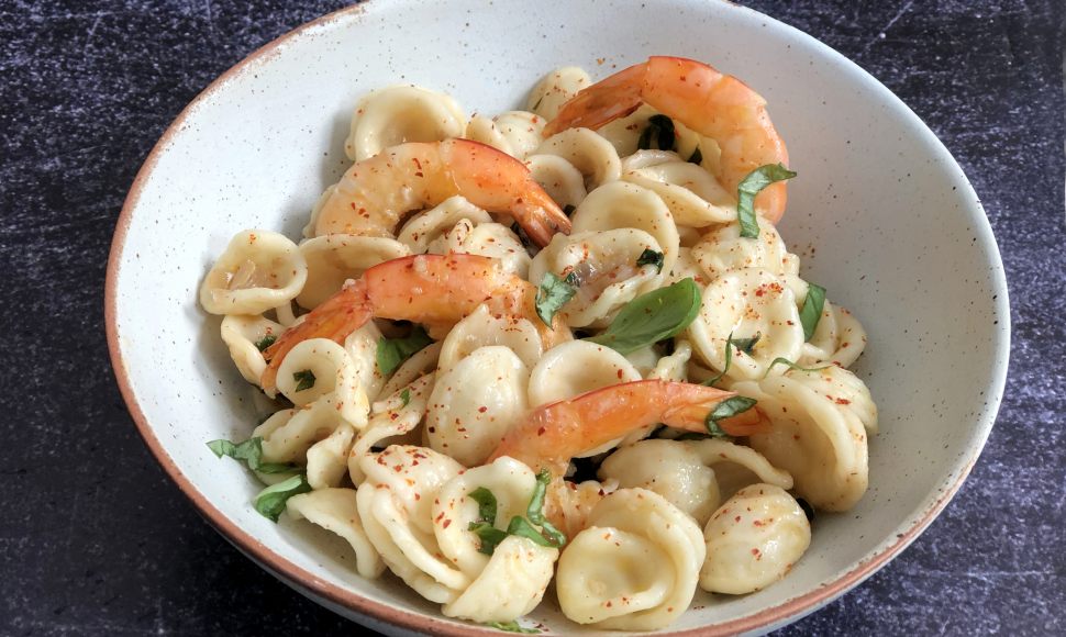 Décortiquez les crevettes en laissant juste la queue. Faites cuire les orecchiette dans de l'eau bouillante salée en suivant les instructions du paquet. Égouttez-les.