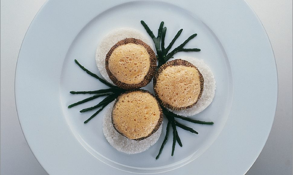 Oursins de roche en coque, condiment d’herbes et de citron du mentonnais, fumet émulsionné au corail