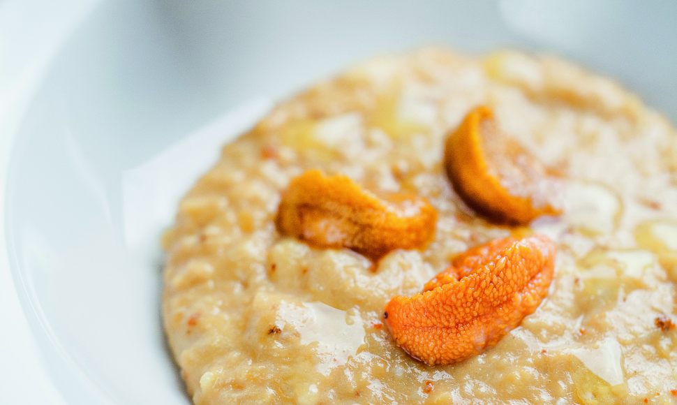 Oursins en brouillade, mouillettes de pain au beurre d’algues