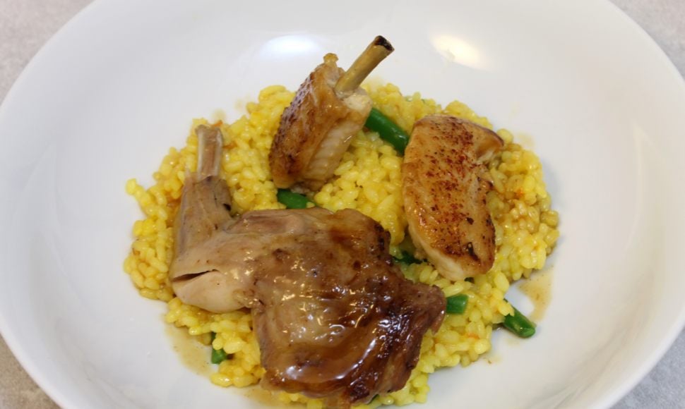 Chauffer un filet d’huile d’olive dans un sautoir. Assaisonner tous les morceaux de poulet et les épaules de lapin, les faire revenir jusqu’à ce qu’ils soient dorés.
