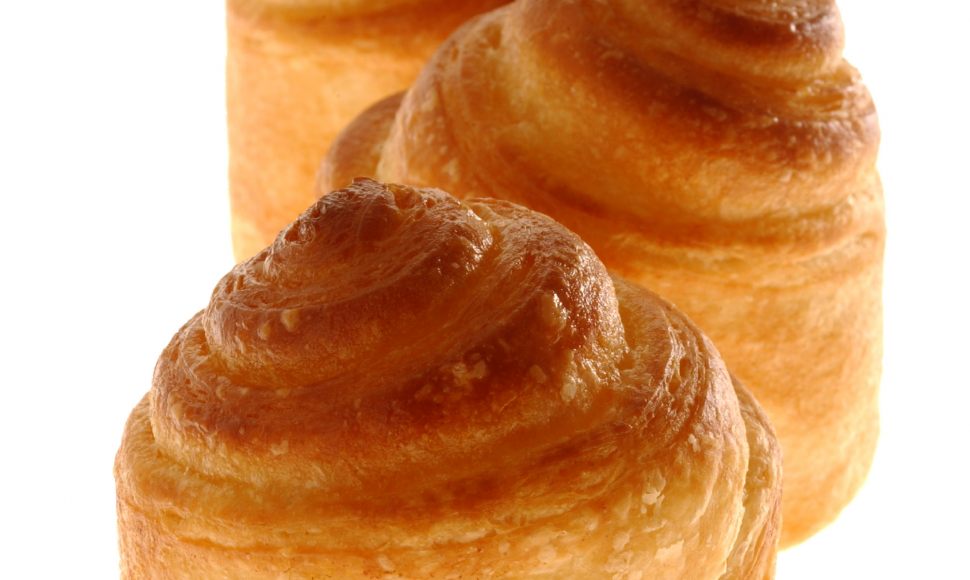 Abaisser la pâte bien froide à 2 mm. Elle doit être très fine pour produire le meilleur feuilletage possible. Badigeonner cette abaisse d’huile d’olive et la parsemer de sel de Guérande. Rouler l’ensemble et le découper en portions de 40 g. Les déposer dans des cercles de 6,5 cm de diamètre et de 4 cm de hauteur. Laisser pousser à l’étuve.
