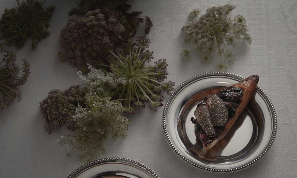 Nettoyez la truffe noire à l’aide d’un pinceau, puis épluchez-la. Râpez-la en fines lamelles. Passez les tranches de pain dans une poêle avec de la graisse de volaille jusqu’à ce qu’elles soient bien blondes, puis égouttez-les sur du papier absorbant. Lustrez-les à l’aide d’un pinceau avec le jus de volaille réduit tiède. Laissez-les refroidir, puis posez de la farce sur chacune.