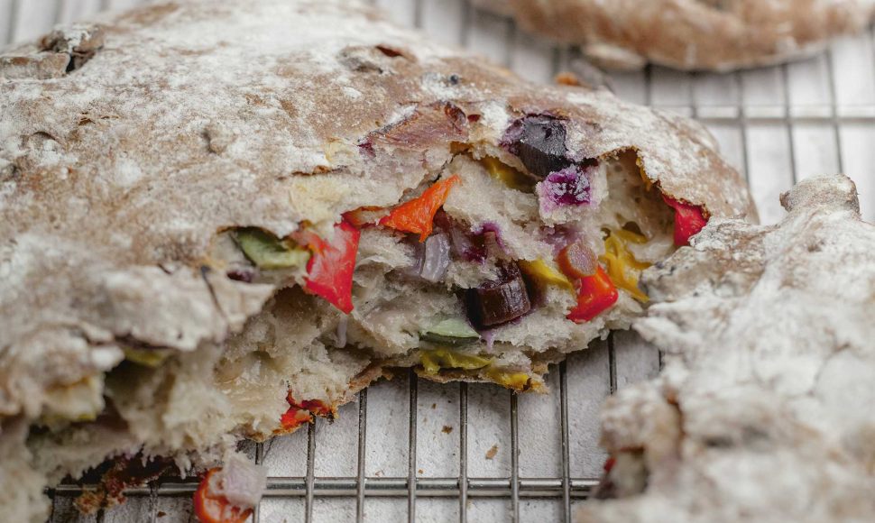 Un pain fait maison aux notes sucrées de poivrons et d'oignon, marié au lard de poitrine fumé.