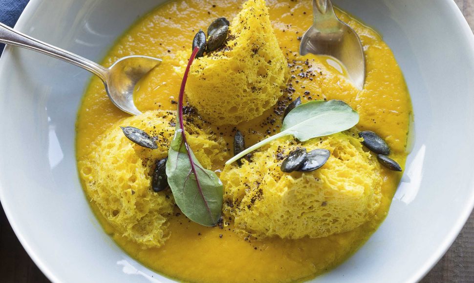 Épluchez la courge et taillez-la en petits dés. Faites-la cuire dans une casserole pendant 20 min environ, puis mixez-la au blender. Réservez 320 g de pulpe pour la confection du pain vapeur, et assaisonnez le reste avec l’huile d’olive, la crème liquide, le sel et le poivre pour obtenir un velouté. Mélangez la pulpe de courge cuite réservée avec les jaunes et les blancs d’œufs, le curcuma, la poudre d’amande et la farine, puis assaisonnez. Versez dans un siphon, ajoutez 2 cartouches de gaz et garnissez des gobelets en plastique de cette préparation à mi-hauteur. Faites cuire 1 min au four à micro-ondes à puissance maximale pour obtenir des pains aériens. Servez-les avec le velouté de courge dans des assiettes creuses.