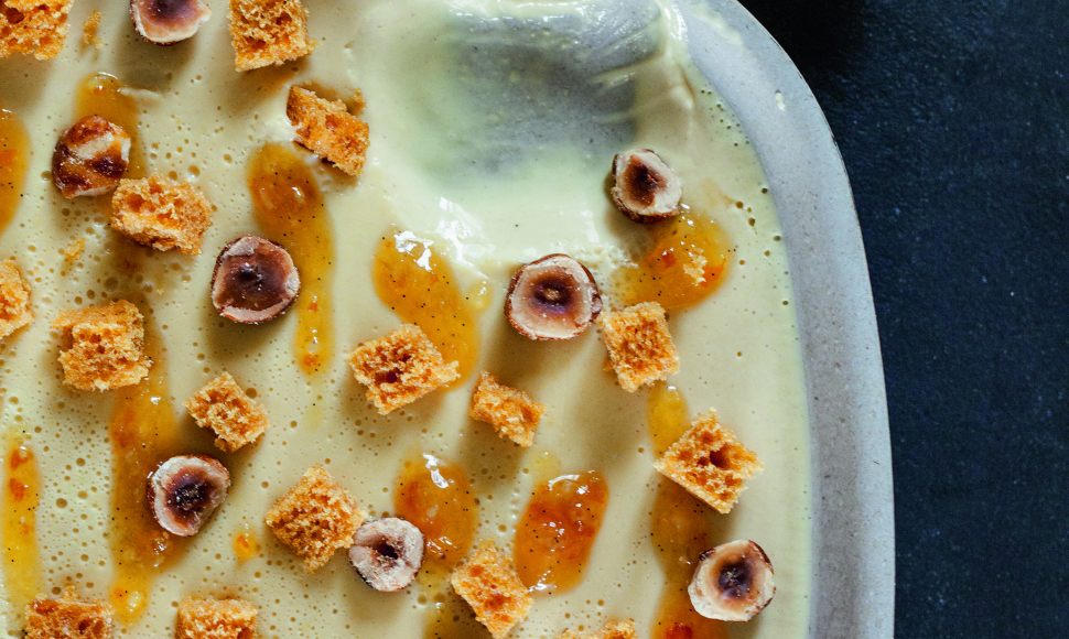 Placez six assiettes creuses au congélateur. Coupez le pain d’épices en petits cubes. Faites chauffer l’eau et la crème dans une casserole, puis ajoutez la moitié du pain d’épices.