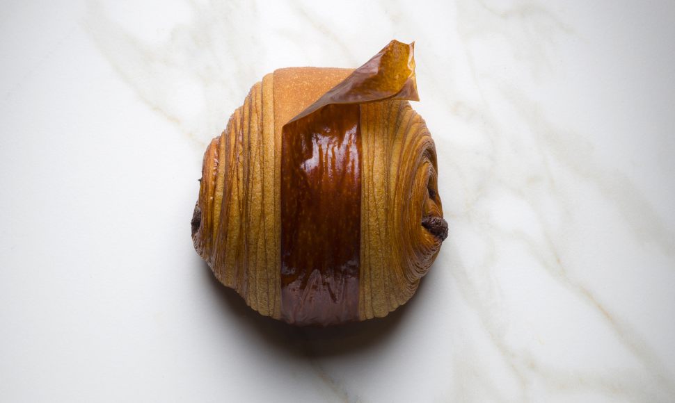 Dégazez en travaillant la pâte à la main. Puis étalez-la selon la largeur du beurre de tourage et le double de sa longueur. Placez-la au congélateur 5 minutes, puis au réfrigérateur 15 minutes. Déposez le beurre de tourage au milieu de la pâte, recouvrez-le avec le bord de la pâte de chaque côté. Placez le beurre apparent face à vous. À l’aide d’un rouleau à pâtisserie, réalisez un tour double : étalez de bas en haut jusqu’à obtenir une épaisseur d’environ 7 mm.