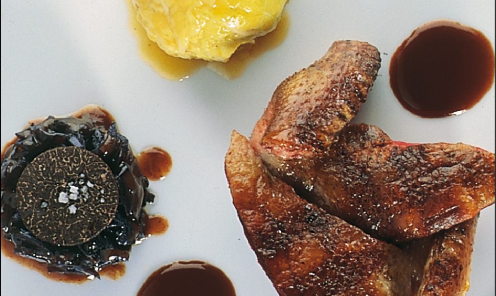 Palombe des cols pyrénéens sur la braise, chou rouge et truffe noire compotés ensemble, chou vert frisé farci de foie gras