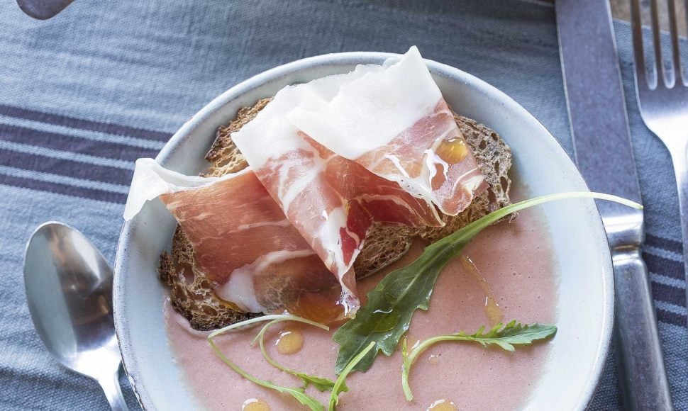 Un plat de tomate mixée avec de la crème, gousse d'ail, gélatine accompagnée de tranches de pain avec du jambon sec.