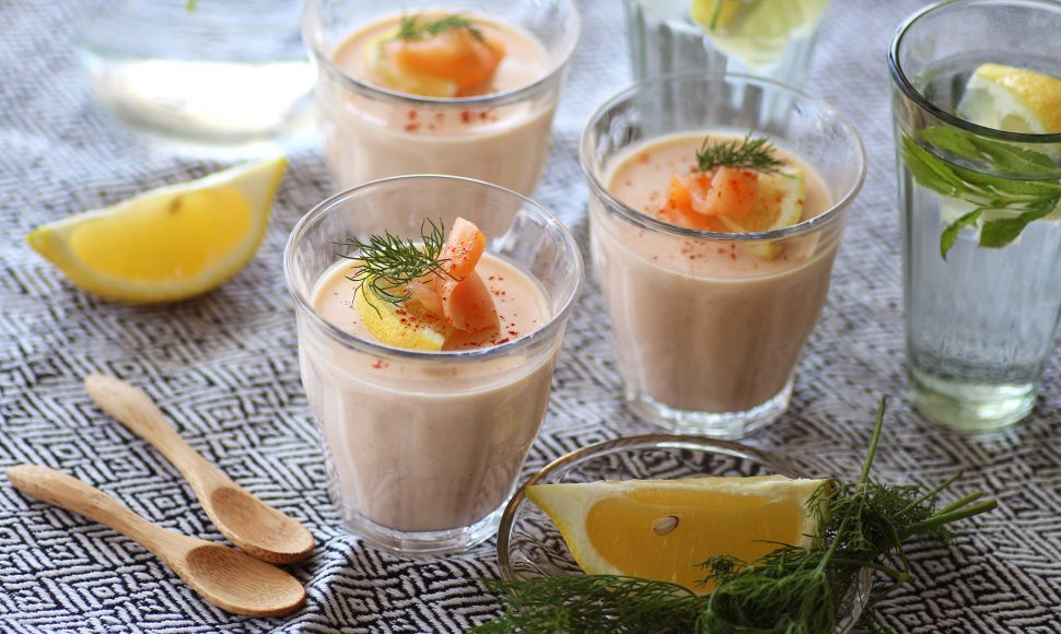 Assaisonner de sel et poivre, puis verser dans des verrines. Laisser refroidir complètement puis entreposer au frais pendant 1 heure avant de servir.