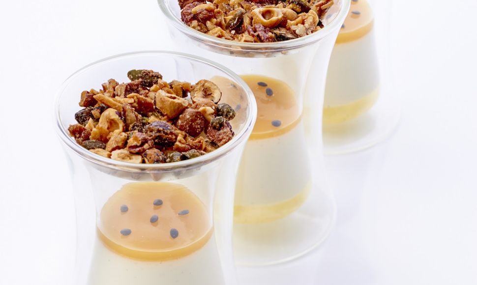 Le plus de cette panacotta ? Cette fine gelée au fruit de la passion et au citron surplombée de fruits secs caramélisés.