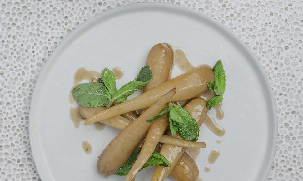 Une entrée autour des légumes oubliés : les panais sont rôtis au miel et accompagnés d'un brin de menthe.