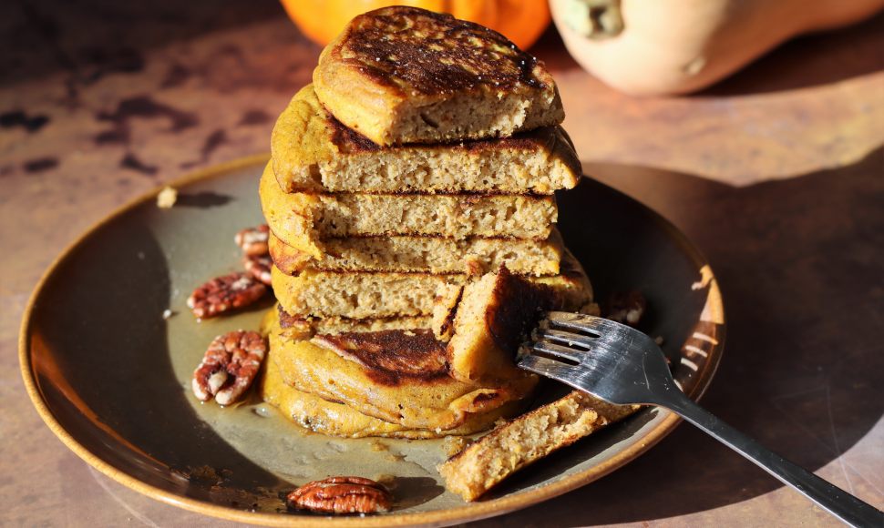 La courge butternut, au goût légèrement sucré, est tout à fait indiquée au moment du dessert ou du goûter, comme ici dans la réalisation de pancakes. Elle apporte une texture moelleuse sans pareille.