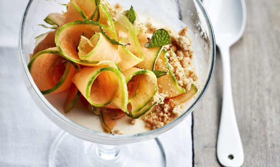 Panna cotta coco, fraîcheur de melon du Haut-Poitou à la menthe, sablé breton