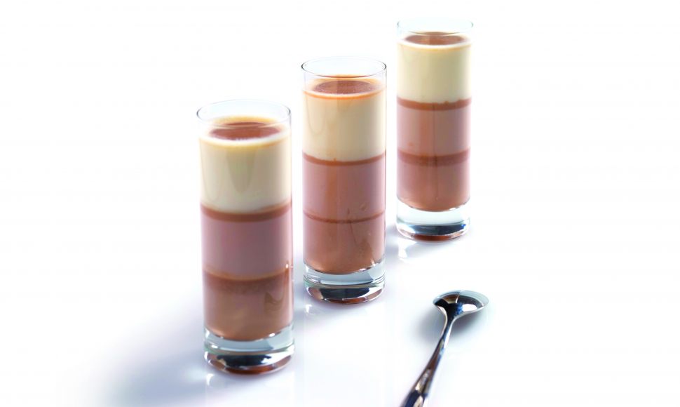 Préparez la pannacotta au chocolat noir : versez le lait dans une casserole. Ajoutez la crème. Faites chauffer à feu moyen. Mettez la gélatine à tremper 5 min dans de l’eau froide.