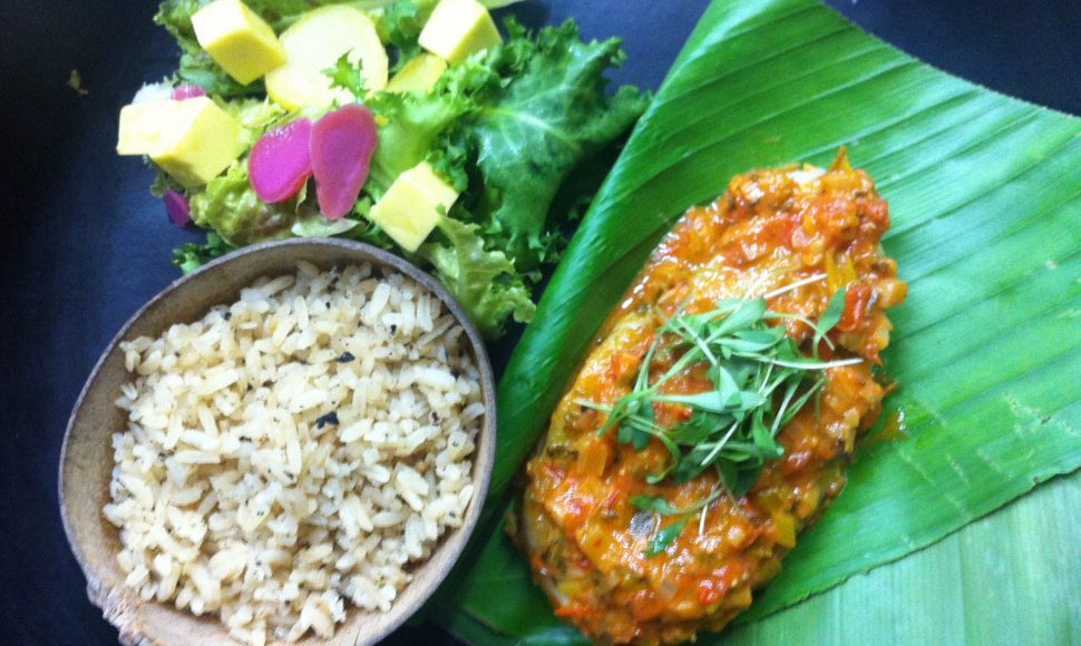 Mettre un peu de sauce à la noix de coco sur une feuille de bananier, placer un filet de poisson, ajouter un peu de sauce par-dessus. Fermer hermétiquement la feuille de bananier et reproduire l’opération pour chaque filet de poisson.