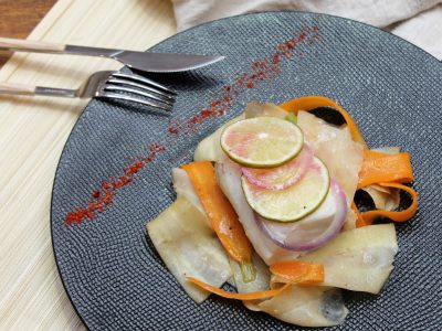 Ces tagliatelles de carottes et de panais parfumées aux 5 épices accompagnent à merveille ce pavé de cabillaud subtilement assaisonné.