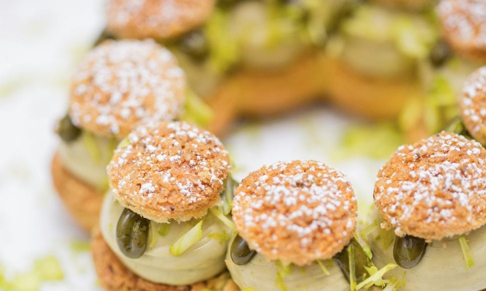 Ce Paris-Brest revisité par Pascal Hainigue marie la douceur de la pistache à la fraîcheur acidulée de la framboise. Entre choux croustillant, crème onctueuse et notes fruitées, il offre une interprétation moderne et gourmande du grand classique.