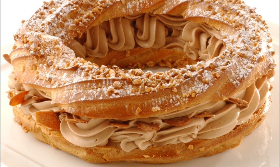 Le Paris-Brest fut créé en 1891 par un pâtissier de la banlieue parisienne. C’est en voyant passer la course cycliste qui se déroulait entre les deux villes qu’il a imaginé ce dessert fourré de crème pralinée. La forme de l’entremets rappelle celle d’une roue de bicyclette.