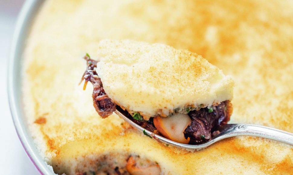 Ajoutez les carottes, les poireaux, le céleri, le bouquet garni et les oignons brûlés. Laissez cuire pendant environ 6 h sur feu doux. Récupérez la viande et effilochez-la avec les mains dans un saladier. Rectifiez l’assaisonnement, puis répartissez-la au fond d’un plat à gratin sur 2 cm d’épaisseur.