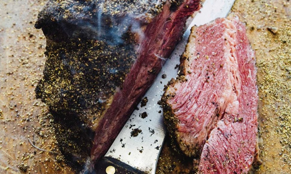 Mélangez toutes les épices et couvrez-en généreusement la poitrine de bœuf saumurée. Disposez la viande dans le fumoir. Fumez à 85 °C pendant 6 h et ajoutez de nouveaux copeaux de bois au bout de 3 h. La poitrine est bien cuite lorsqu’elle est ferme, mais pas dure. Sortez-la du fumoir et faites-la refroidir rapidement à 3 °C au congélateur.