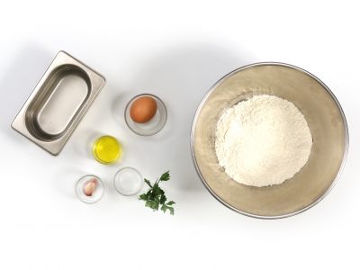 Éplucher et dégermer la gousse d’ail. Laver, sécher et effeuiller le persil. Dans un cul-de-poule, mélanger la farine et le sel. Creuser une fontaine. Y casser l’œuf et y verser l’eau. Bien les mélanger avec un fouet. Ajouter un filet d’huile d’olive et un peu d'eau. Mélanger. Verser le reste de l'eau progressivement en remuant avec un fouet. Filtrer la pâte dans un chinois posé sur un cul-de-poule afin qu’elle soit bien lisse.