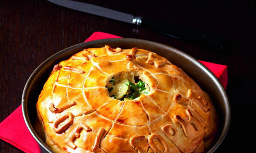 Préchauffez le four à 180 °C (th. 6). Remplissez le moule de la préparation. Rabattez la pâte vers l’intérieur. À l’aide d’un pinceau, badigeonnez les bords de jaune battu mélangé à un peu d’eau. Découpez dans la deuxième pâte un disque de la grandeur du moule et posez-le sur le dessus. Soudez bien les bords puis badigeonnez de nouveau du mélange jaune d’œuf-eau. Avec la pointe d’un petit couteau, dessinez de jolies rayures sur votre pâte. Mettez au four pendant 45 min.