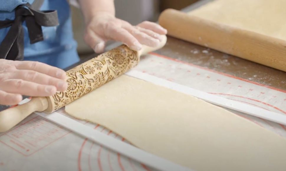 Cette étape de préparation du pâté en croûte doit être réalisée la veille, après avoir réalisé la mêlée, et avant de foncer le moule. La cheffe utilise un rouleau à empreinte, libre à vous d'utiliser un rouleau à pâtisserie lisse.