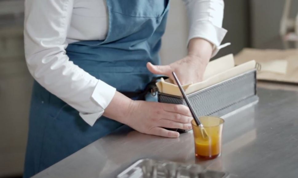Cette étape de préparation du pâté en croûte est à réaliser la veille. La cheffe utilise un moule à charnière de 30 cm de long.