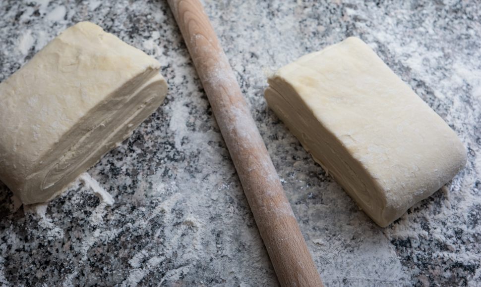 Pendant ce temps, travaillez le beurre de tourage afin de le ramollir et lui donner la même consistance que la pâte. Sortez la pâte du réfrigérateur et abaissez-la au rouleau en forme de rectangle.