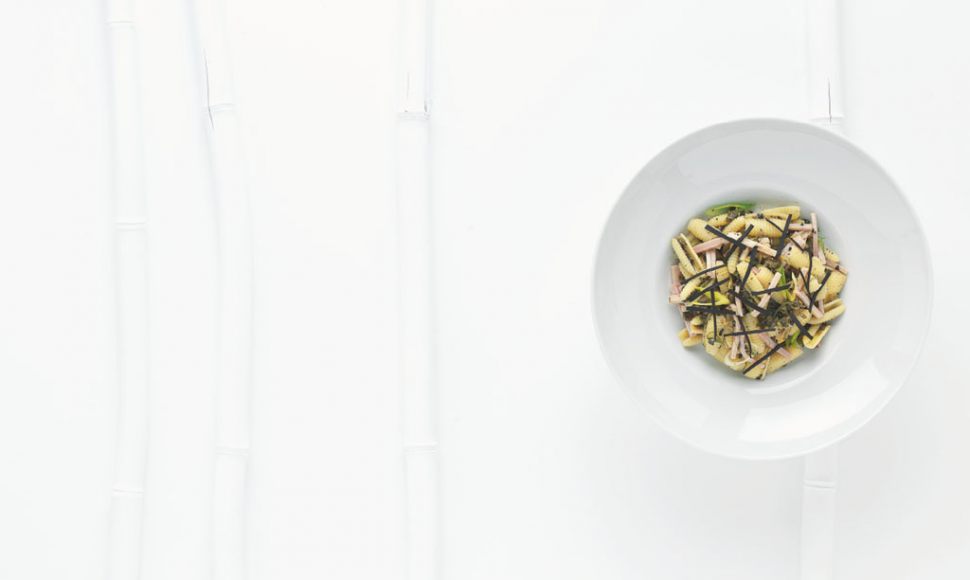 Pâtes artisanales, julienne de jambon, condiment truffe noire
