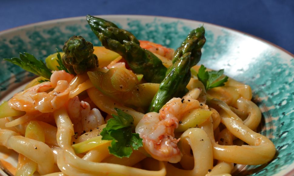 La sauce : Éplucher les gambas et les séparer de leurs têtes. (Si les gambas sont trop grosses, les découper en deux dans la longueur). Couper les tomates pelées en petits dés. Dans une deuxième casserole, faire revenir les têtes des gambas, ajouter les dés de tomates pelées, l’ail, le persil, et un filet d’huile d’olive. Bien écraser le tout pour en faire sortir le jus puis déglacer au vin blanc. (Vin blanc de l’Etna). Ajouter une louche d’eau des asperges et laisser cuire 10 min à feu doux. A la fin de la cuisson, émulsionner et filtrer le tout.