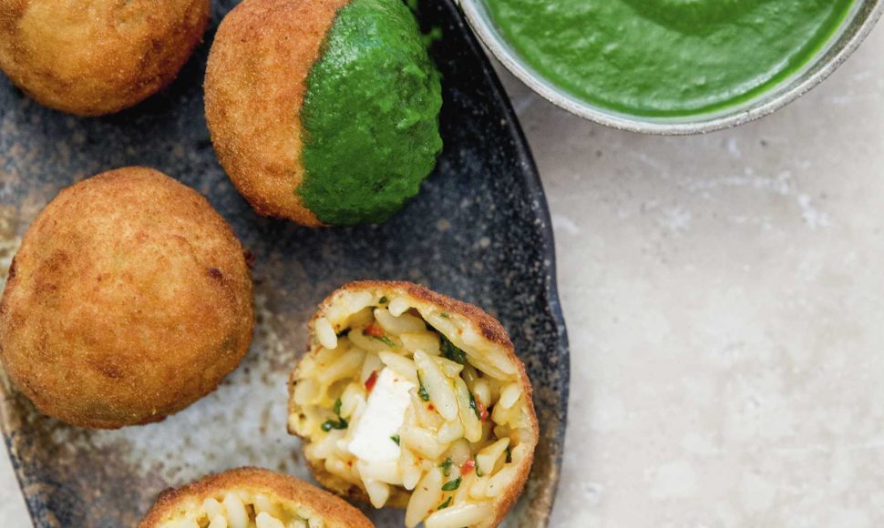 Une recette très originale venue de Grèce : des pâtes avoines en risotto façon cromesquis, feta de brebis et leur condiment persil-raifort. Quel délice !