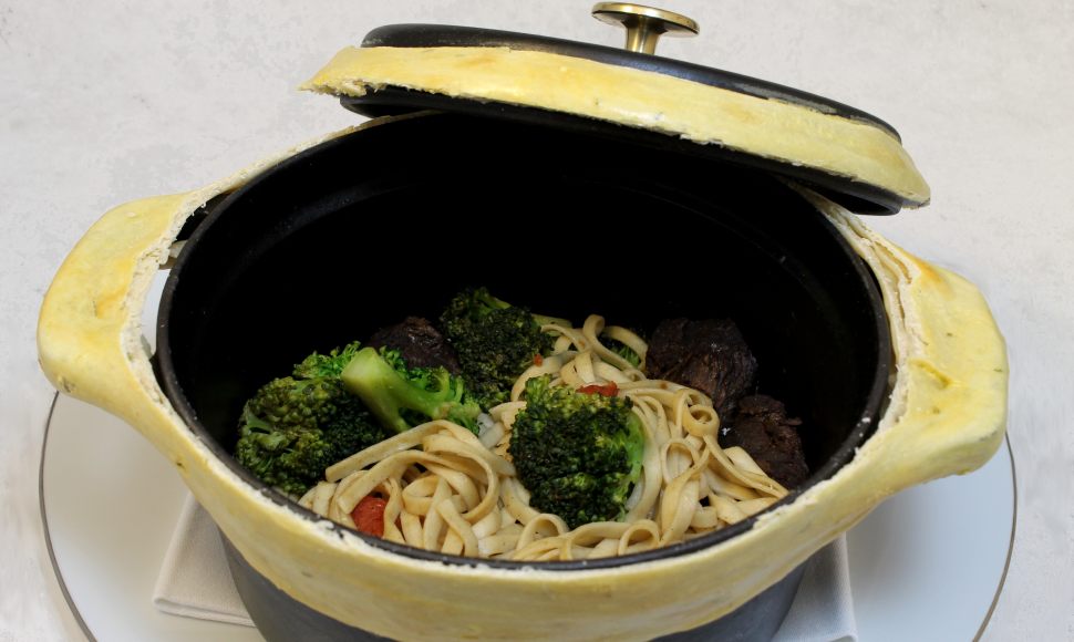La bonne façon d’utiliser un reste de daube ? Mêler ses saveurs provençales à des pâtes « al dente » et à des brocolis croquants. Ce qui vous fait un plat complet et familial, mais cuisiné dans de petites cocottes lutées d’une pâte parfumée. Chacun en cassera la croûte et aura la surprise de ce plat goûteux.