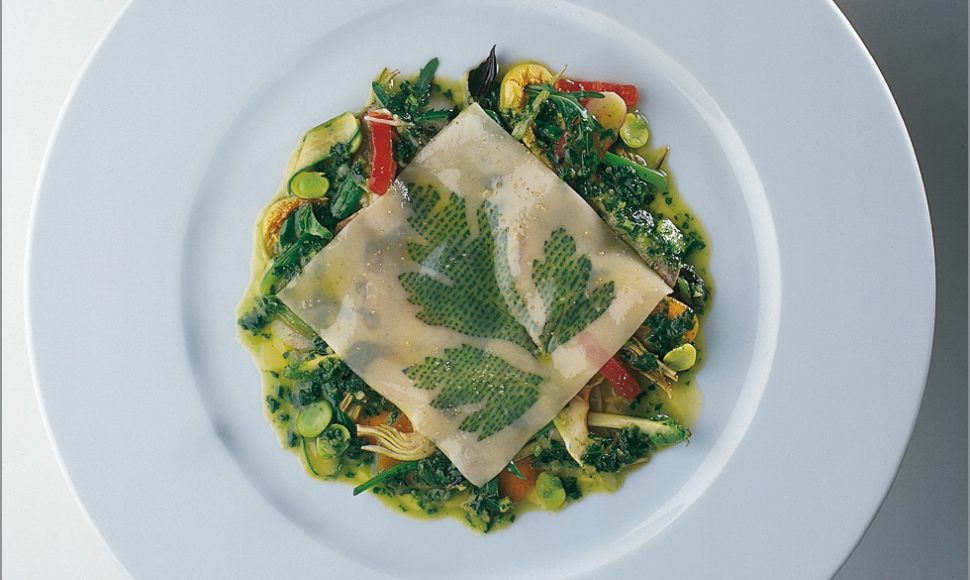 Pâtes fraîches imprimées de persil plat, poêlée de légumes tendres à peine liés d’un pistou d’herbes