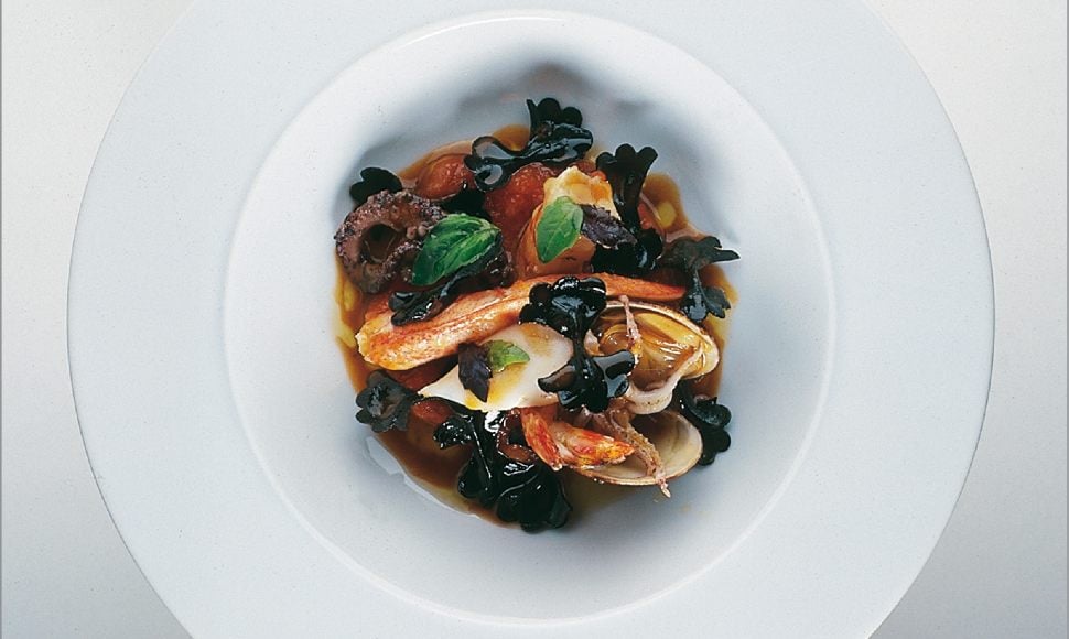 Pâtes papillon à l’encre de seiche, palourdes, grosses crevettes, poulpe de roche et pistes, compotée de tomates confites et fraîches