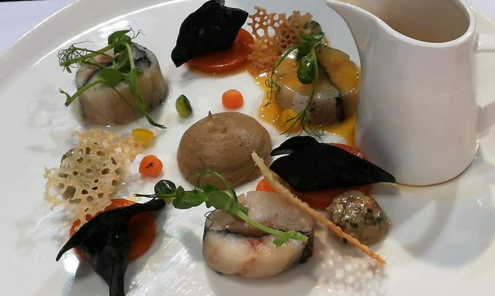 Nettoyer le loup et ôter la peau. Garder les parures et les arêtes. Dégorger. Badigeonner les filets d’encre de seiche d’un côté, saupoudrer de Transglutaminase, puis rouler les filets par deux ou trois selon l’épaisseur dans un film alimentaire pour former un boudin. Plonger dans un bain à 51°C avec le thermoplongeur, surveiller la cuisson à 50 à cœur.