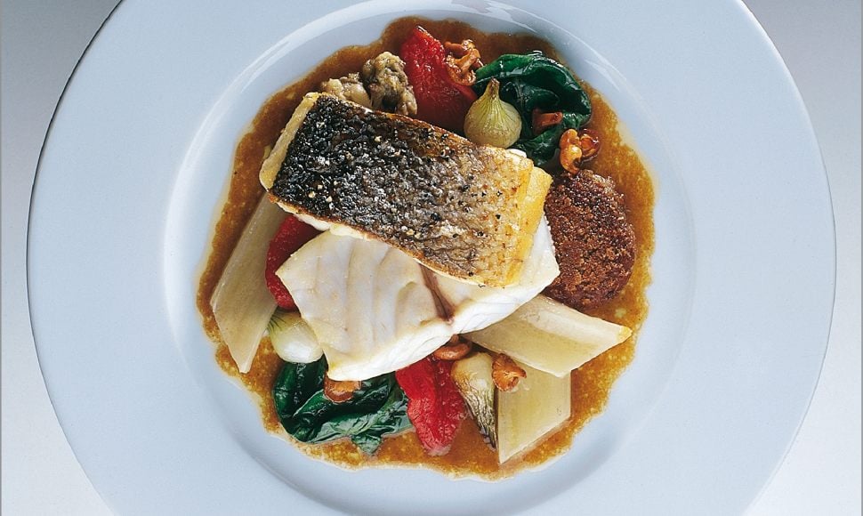 Pavé de loup de méditerranée piqué de fenouil et d’ail confit, cuit lentement pour être fondant, la peau croustillante, aubergines moelleuses, jus vinaigré
