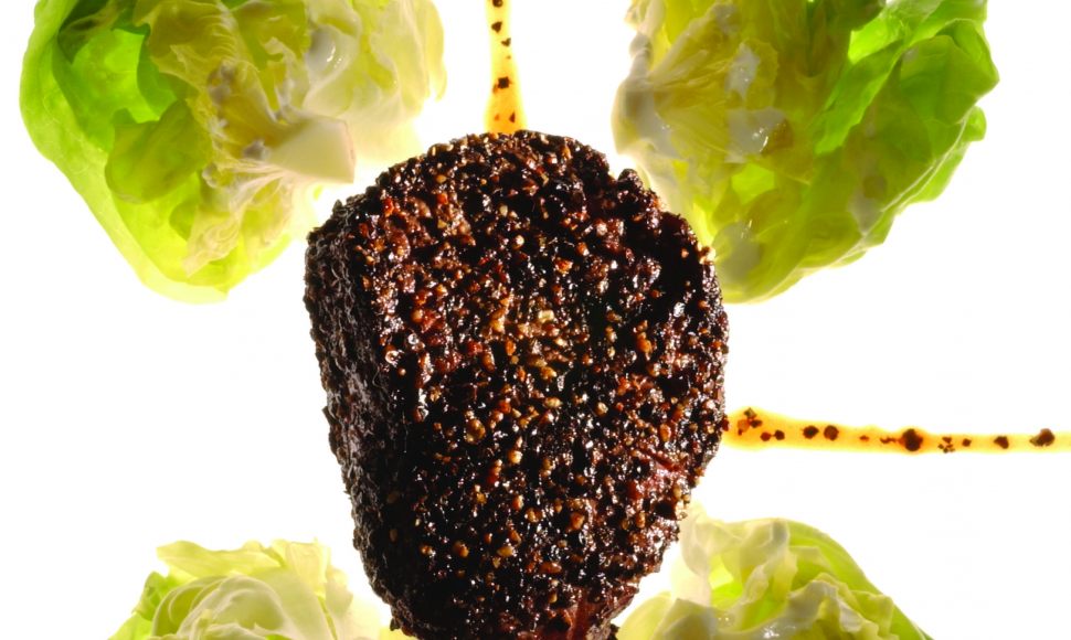 Pavé de rumsteck au sautoir, sauce poivre, cœur de laitue à la crème