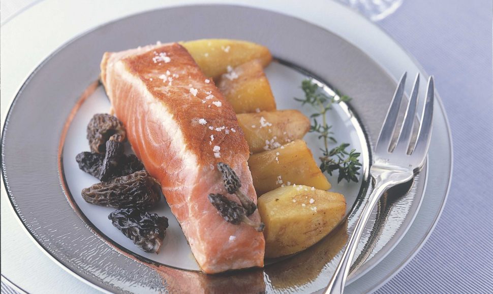 Un pavé de saumon aux morilles et pommes de terre au beurre clarifié.