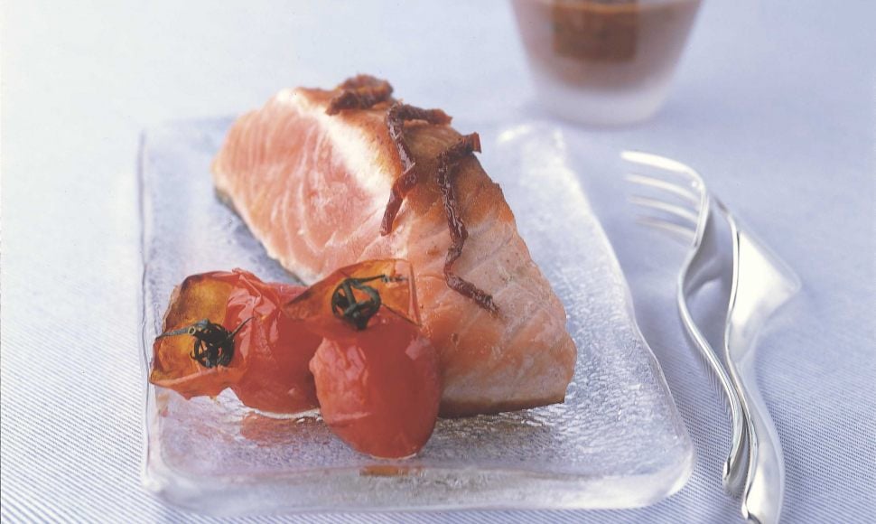 Des pavés de saumon et tomates confites accompagnés d'une sauce au vinaigre balsamique et tomate.