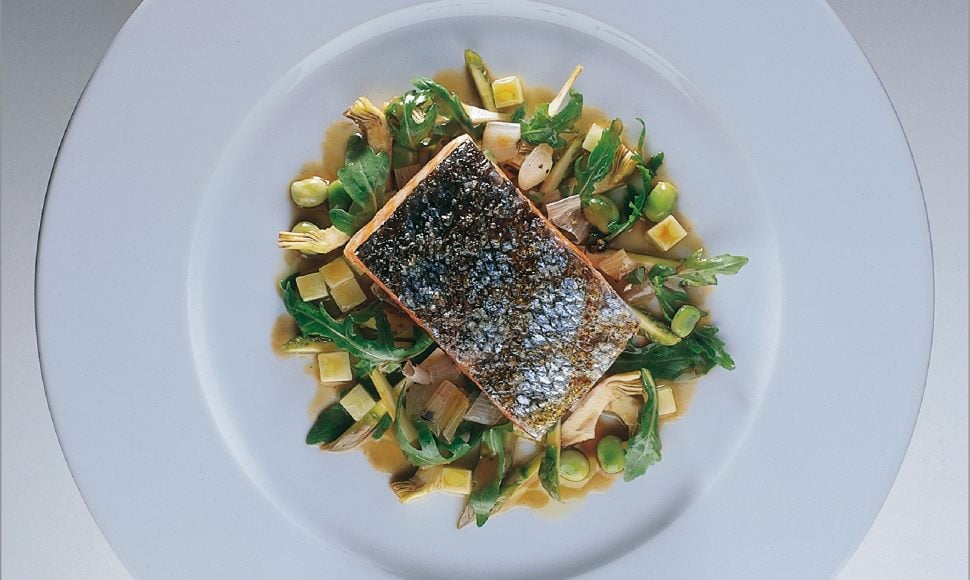 Pavé de saumon sauvage de l’adour grillé au feu de bois, réduction d’échalotes au vin blanc, févettes et cœurs d’artichaut, riquette et marjolaine
