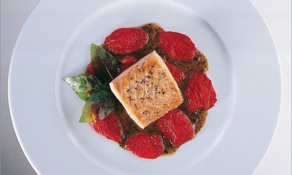 Pavé de saumon sauvage de loire à la poêle, beurre noisette aux truffes écrasées, tomates confites et basilic en friture