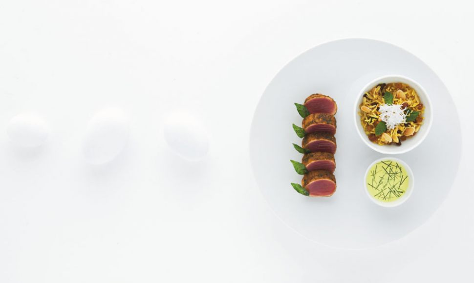 Pavé de thon snacké aux épices mauriciennes, condiment curry poulet, riz à l’orientale