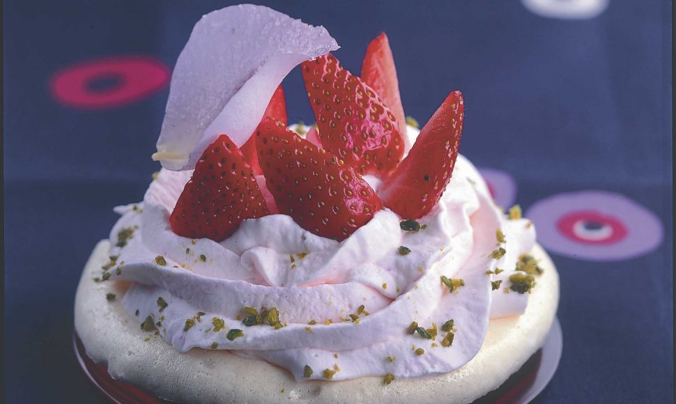 La pavlova est croustillante à l'extérieur et moelleuse à l'intérieur, nappée de crème fouettée et recouverte de fraises et pistaches. Ce dessert à base de meringue est exquis et raffiné.