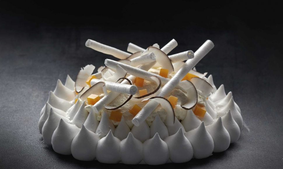 La pavlova est un gâteau traditionnel russe qui a retrouvé récemment ses lettres de noblesse. Ce qui me plaît dans cet entremets, c'est l'alliance des différentes textures : une meringue fine et légère craquant sous la dent, surmontée d'une crème Chantilly onctueuse et d'un mariage exotique de passion, mangue et coco qui vient apporter de la fraîcheur. Un entremets pour faire voyager...