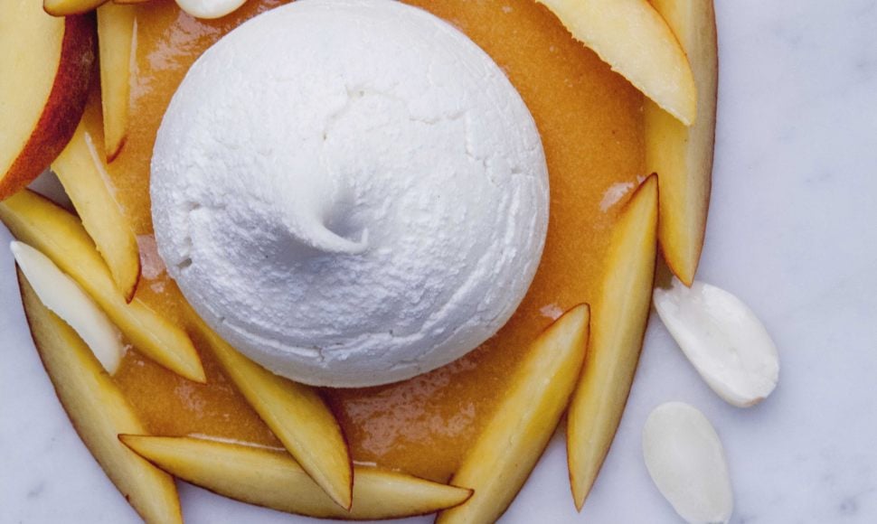 Une onctueuse crème à l'amande, une vinaigrette originale à la pêche et l'huile d'olive, le tout surmonté d'une boule de meringue, un dessert fruité et gourmand !