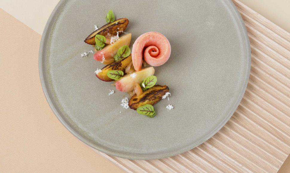 Dans ce dessert, la pêche est travaillée assez simplement, fraîche et rôtie, mais aussi de façon plus singulière : cuite entière au barbecue. Elle repose sur un lit de pistou d'oseille, accompagnée d'un sorbet pêche-citron.