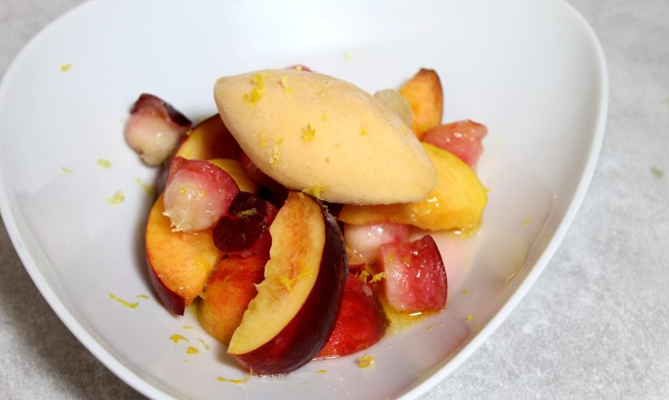 Ce dessert qui évolue entre fraîcheur et douceur, exige que les pêches soient à parfaite maturité. C’est alors que l’accord assez inattendu de l’huile d’olive citronnée et sucrée et de ce fruit trouve sa plénitude.
